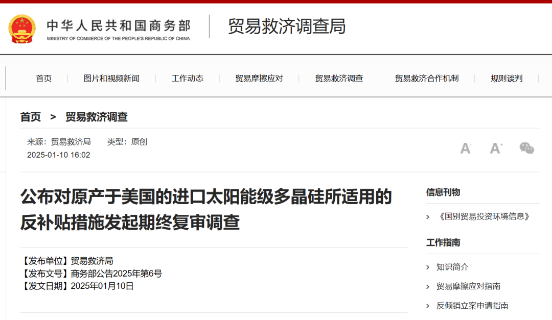 2024年11月18日,商务部收到四川永祥多晶硅有限公司等13家公司代表国内太阳能级多晶硅产业提交的反补贴措施期终复审申请书。申请人主张,如果终止反补贴措施,原产于美国的进口太阳能级多晶硅对中国的补贴可能继续或再度发生,对中国产业造成的损害可能继续或再度发生,请求商务部对原产于美国的进口太阳能级多晶硅进行期终复审调查,并维持对原产于美国的进口太阳能级多晶硅实施的反补贴措施。