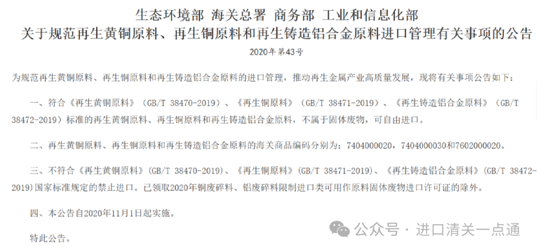 与 2020 年第 43 号公告相比,再生铝原料的分类更加细致。不再统一归类为 “铸造铝合金原料”,而是进一步细分为 “纯铝原料”“变形铝合金原料” 及 “铸造铝合金原料” 三类。再生黄铜原料也更新为 “铜合金原料”,这种分类调整让进口管理更加科学、规范。