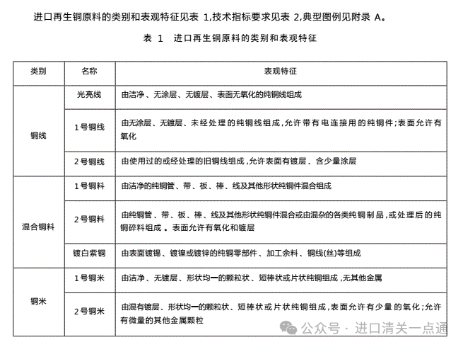 公告附表显示,“可进口再生铜种类” 有 “再生铜原料”“再生铜合金原料” 。